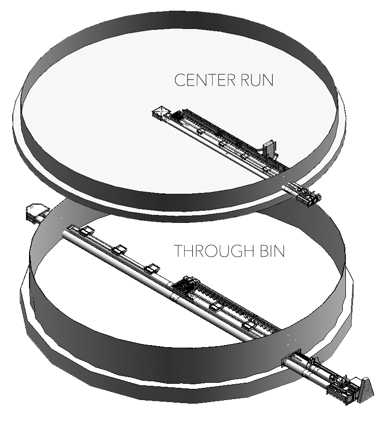 - Center-Run: A compact, cost-effective option that runs to the center of the bin, offering the same low underbin height, high capacity, and low maintenance as the through bin.
